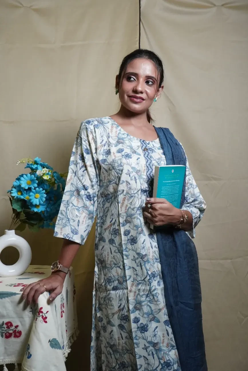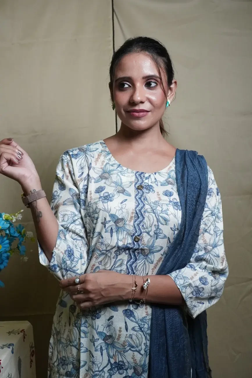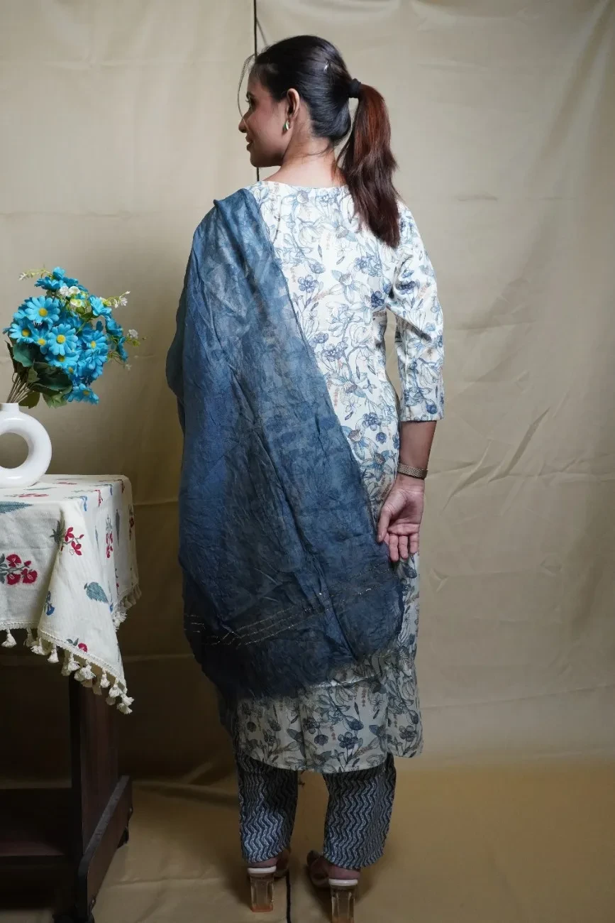 Elevate your ethnic wardrobe with this elegant cream and blue printed three-piece cotton suit set. The kurta features a soothing floral print in soft tones of blue and beige, offering a graceful yet contemporary appeal. It is tailored in a straight fit with a round neckline and three-quarter sleeves for added comfort and ease of movement.