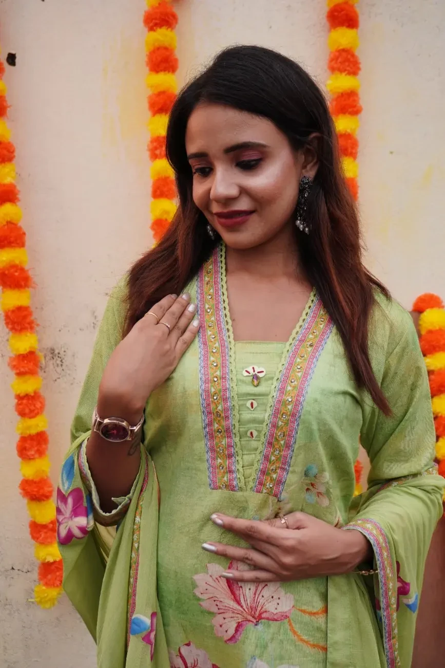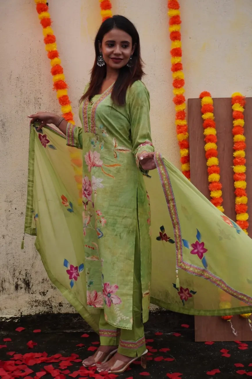 Bring freshness to your festive wardrobe with this graceful green kurta set, beautifully designed with handpainted floral motifs and delicate embroidery. The soft tones and artistic details make it an elegant pick for any occasion.