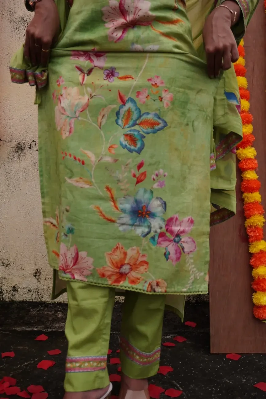 Green Handpainted Floral Kurta Set with Chiffon Dupatta