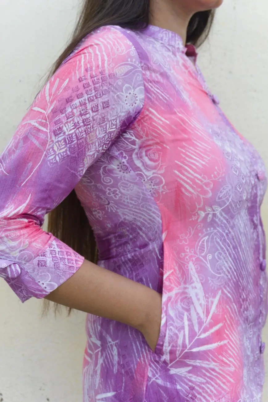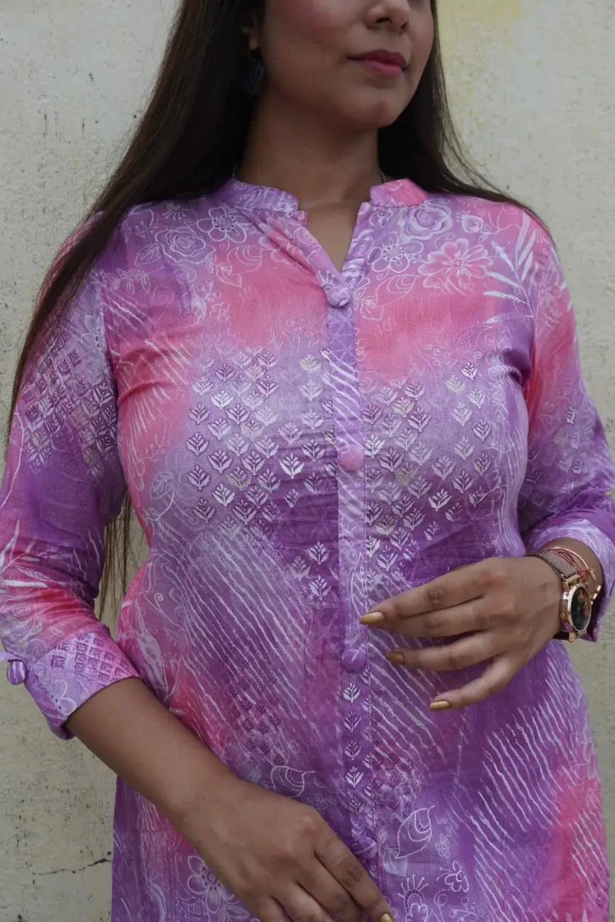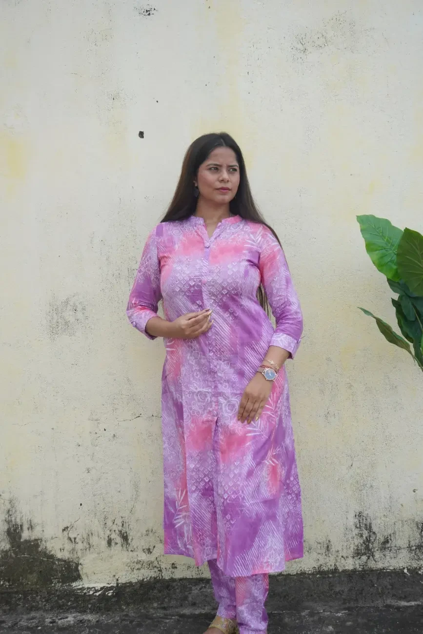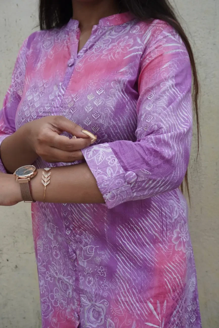 Refresh your ethnic wardrobe with this elegant lavender and pink kurta set, crafted in soft and breathable cotton fabric. The kurta features a vibrant blend of abstract and floral prints in pastel hues, creating a dreamy fusion of modern and traditional aesthetics. Designed with a straight silhouette, mandarin collar, and 3/4th sleeves, it offers all-day comfort without compromising on style.
