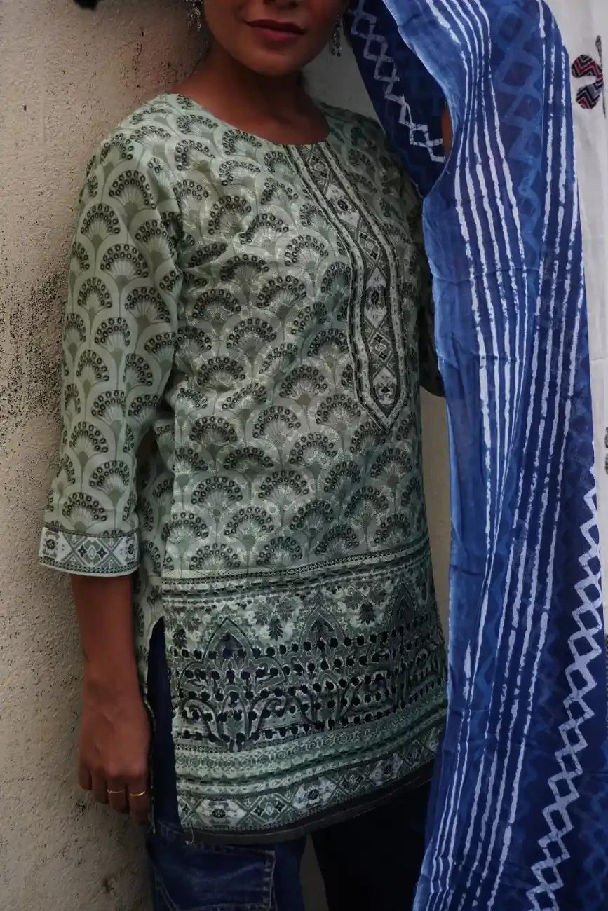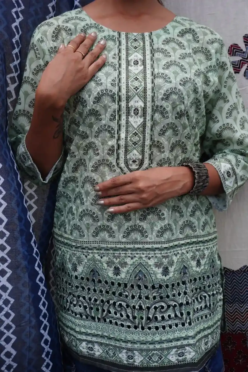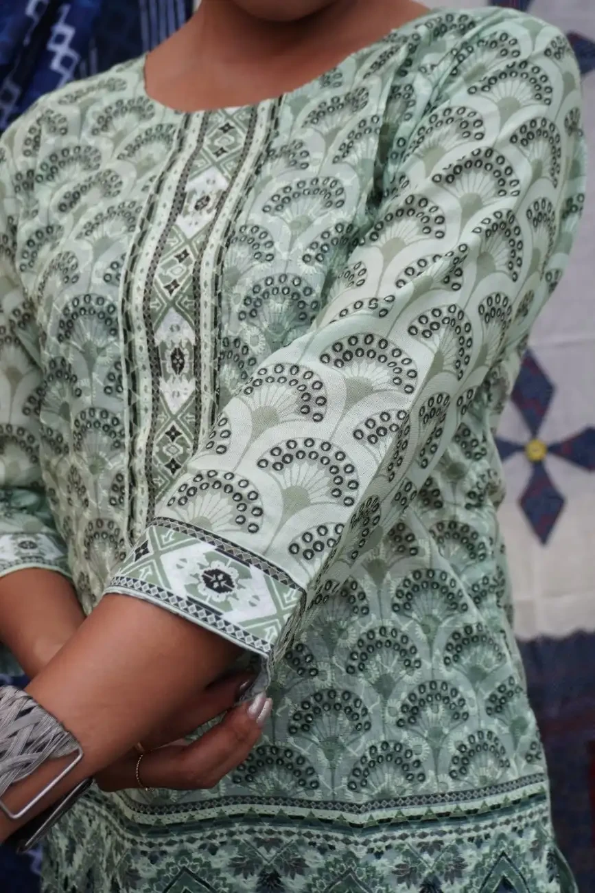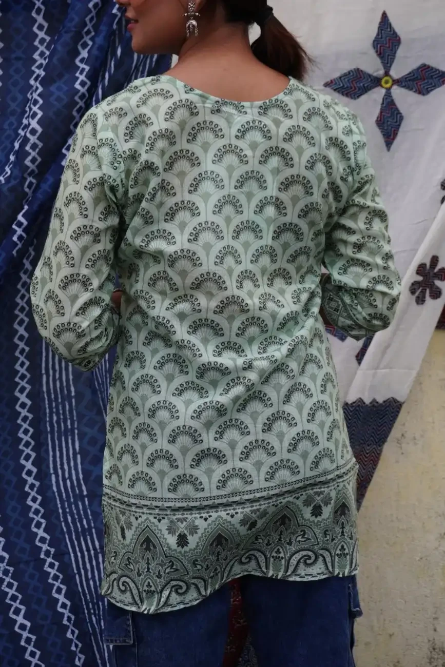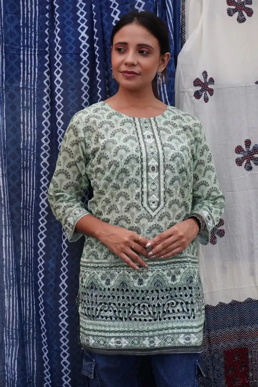 Add a touch of elegance to your everyday wardrobe with this beautifully designed printed kurti. Crafted from a soft cotton blend, this kurti features a light green base adorned with delicate geometric motifs and a vibrant embroidered-style panel at the neckline. The 3/4th sleeves and hemline are highlighted with intricate borders in striking shades of light green, offering a perfect blend of tradition and modernity.