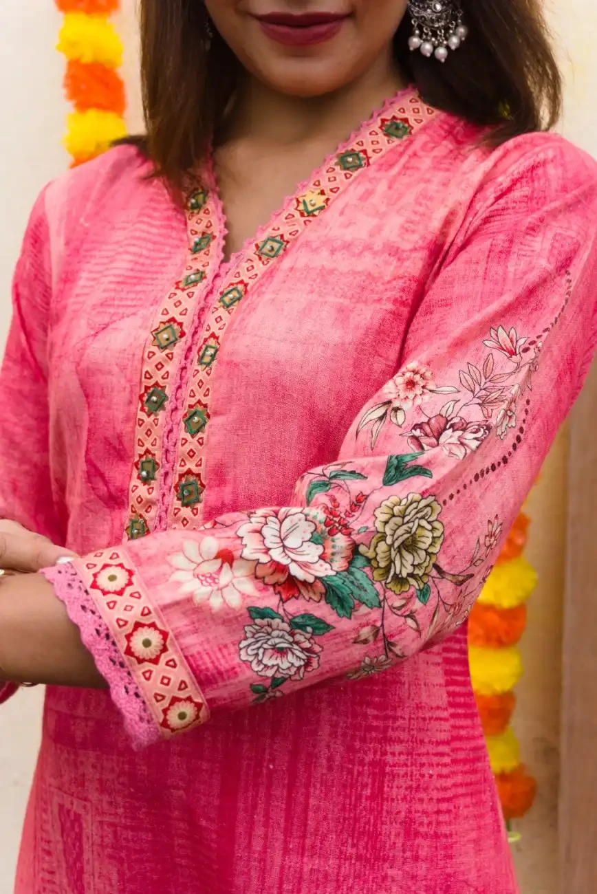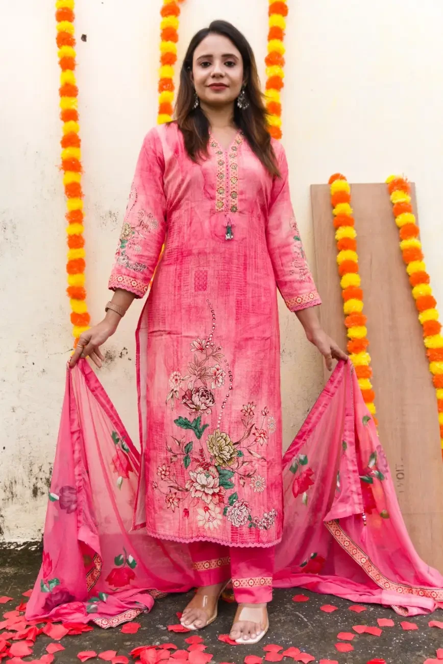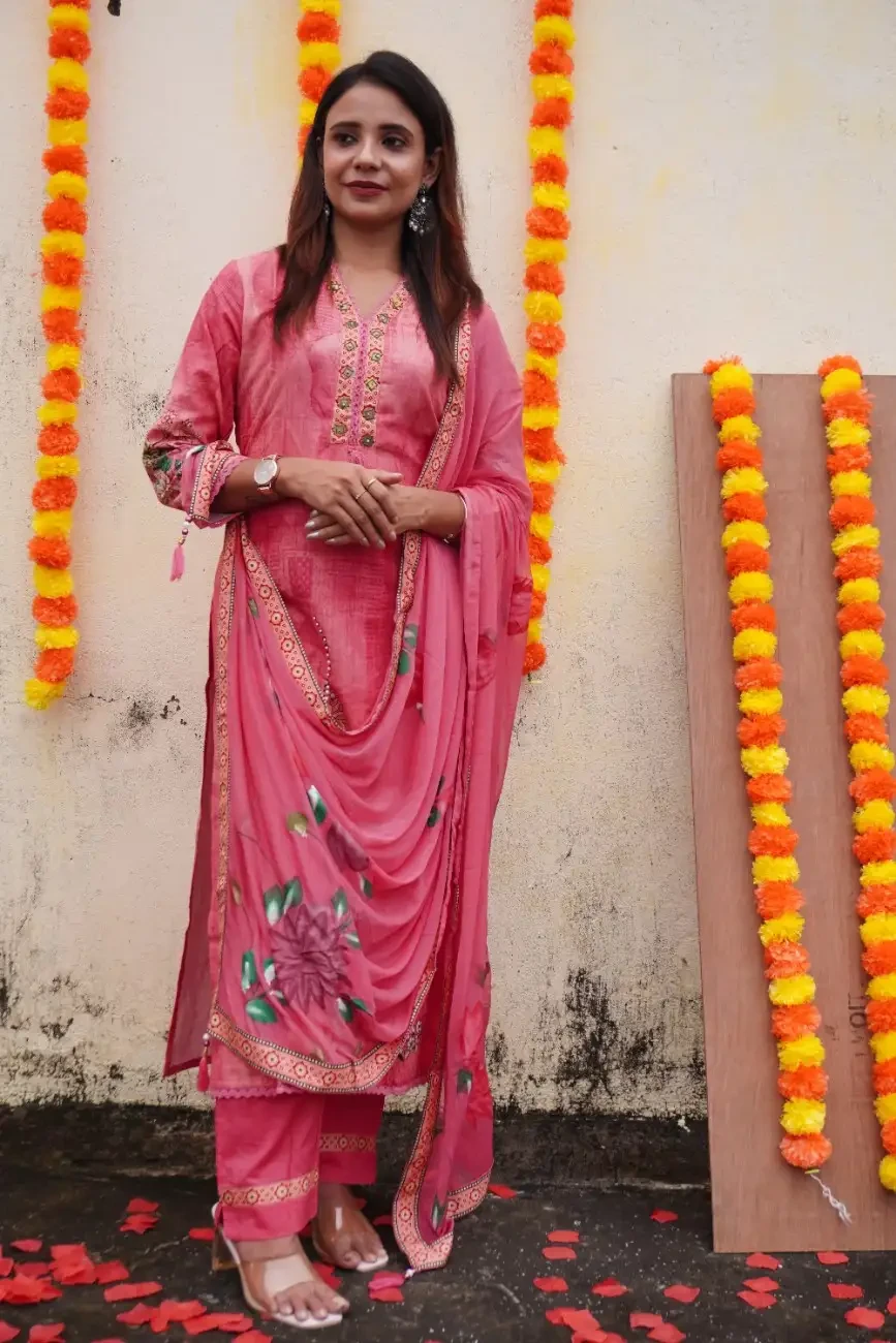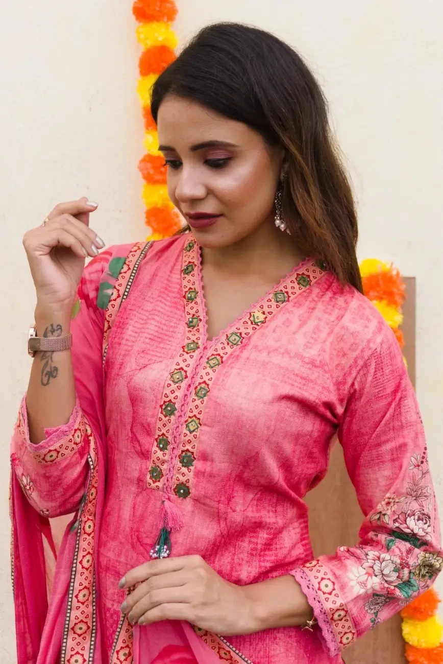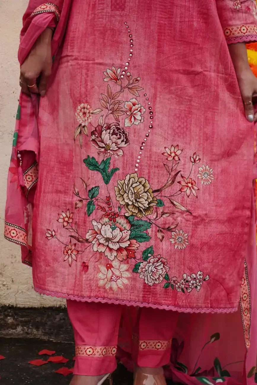 Step into timeless elegance with this beautifully crafted three-piece cotton suit set, featuring intricate handpainted floral artwork. Designed in a rich pink shade, the kurta is adorned with delicate detailing and traditional motifs that enhance its charm. The matching bottom complements the look, while the lightweight cotton dupatta with subtle floral accents adds a graceful finishing touch.