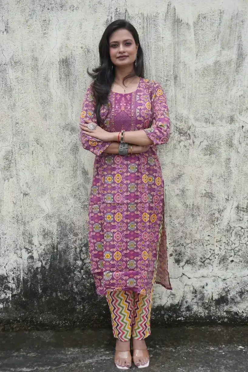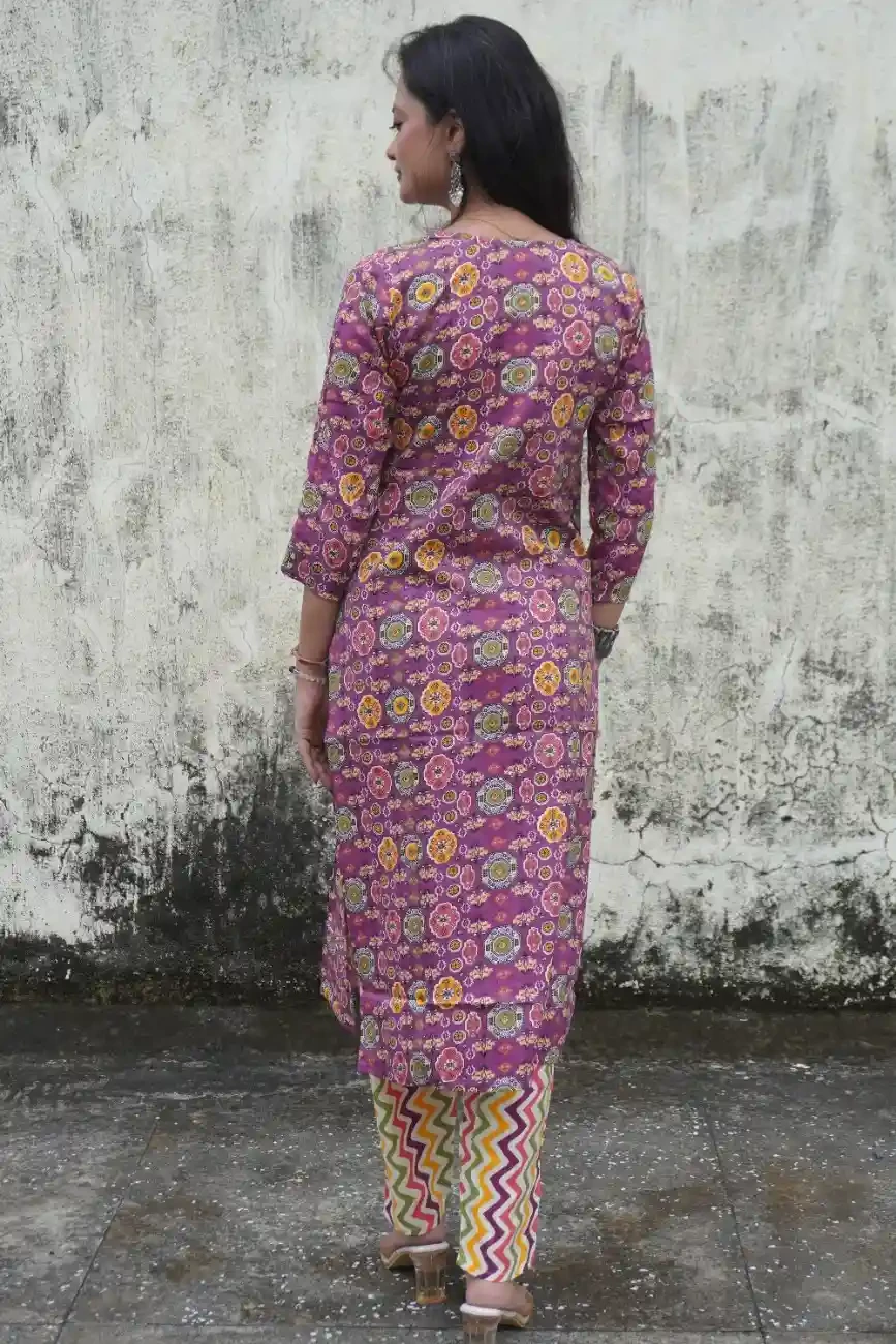 - Kurta: Straight-fit purple kurta adorned with multicolor ethnic prints, featuring a round neckline and three-quarter sleeves for a graceful finish.