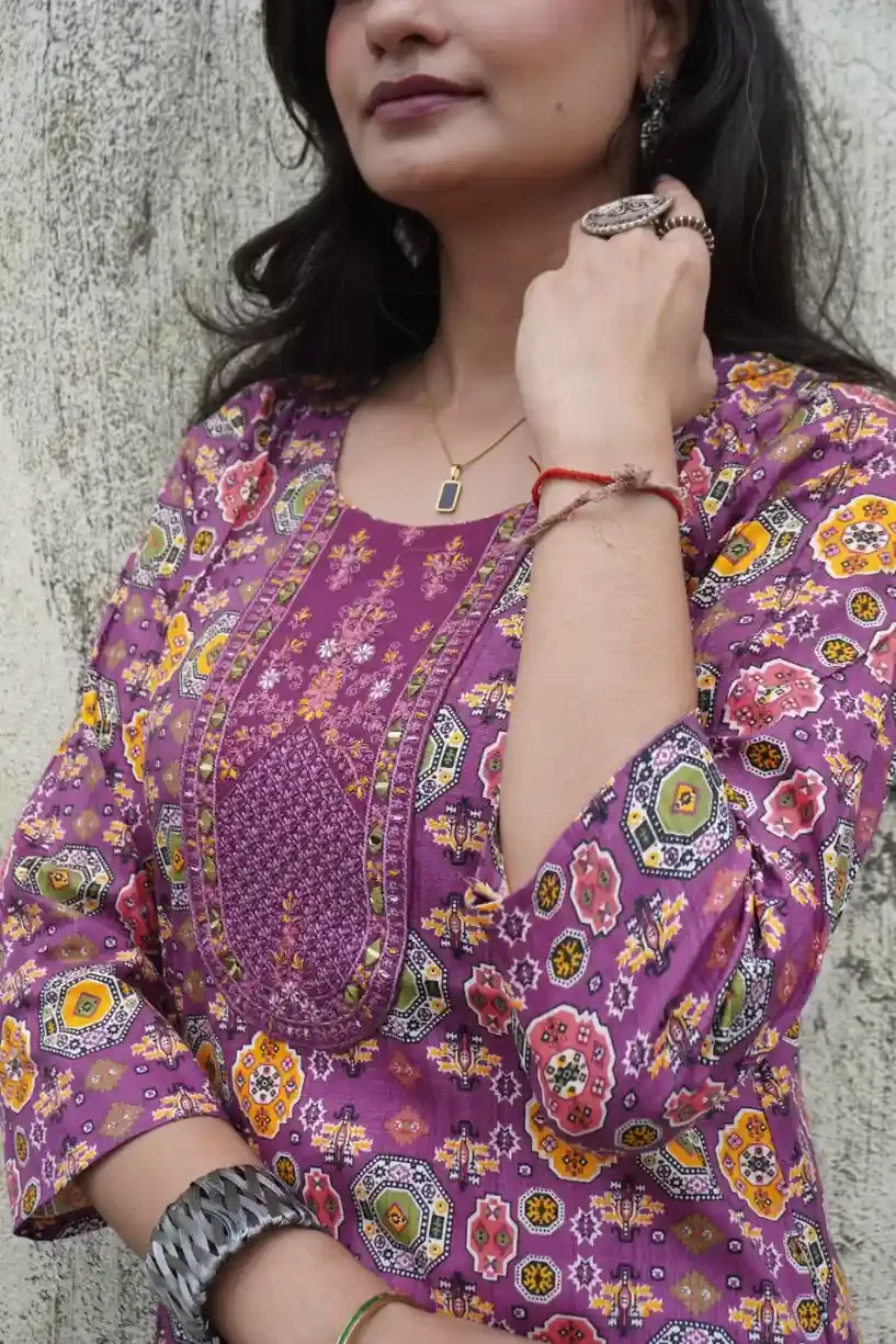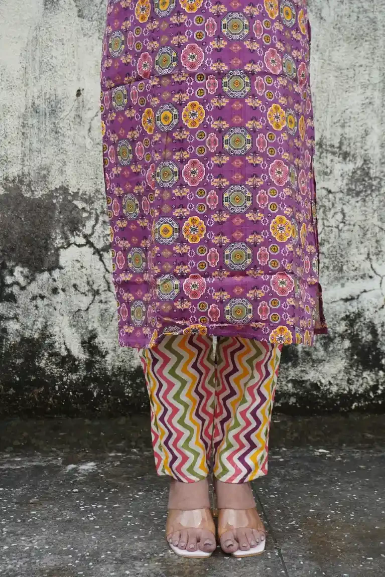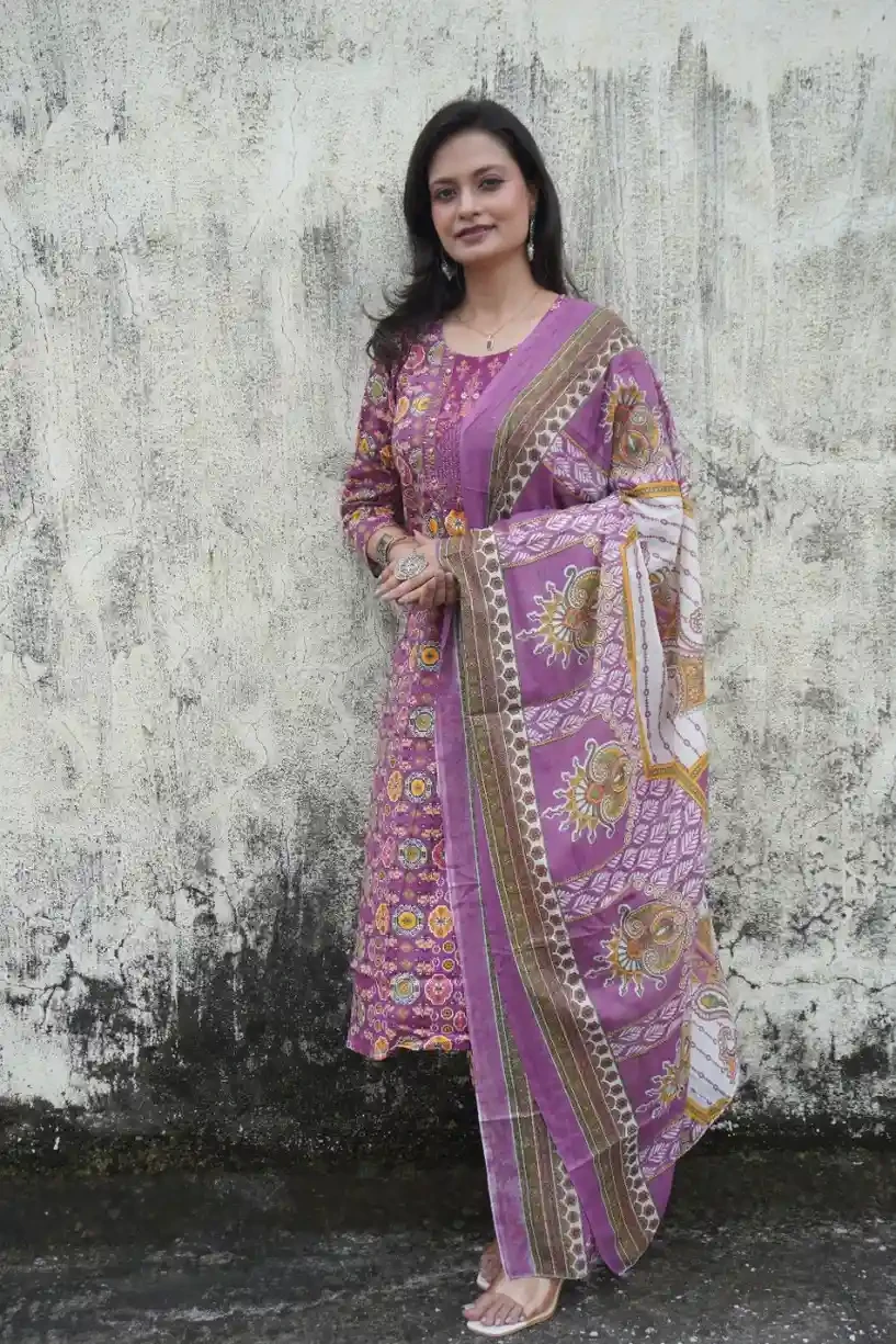 Make a vibrant statement with this purple printed cotton salwar suit set, beautifully designed with intricate ethnic motifs and rich colors. Perfect for festive occasions, casual gatherings, and cultural celebrations, this set offers both elegance and comfort.