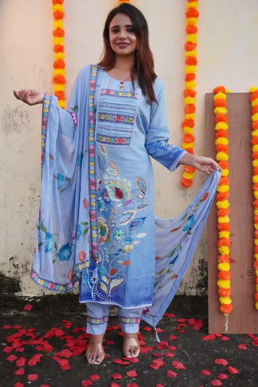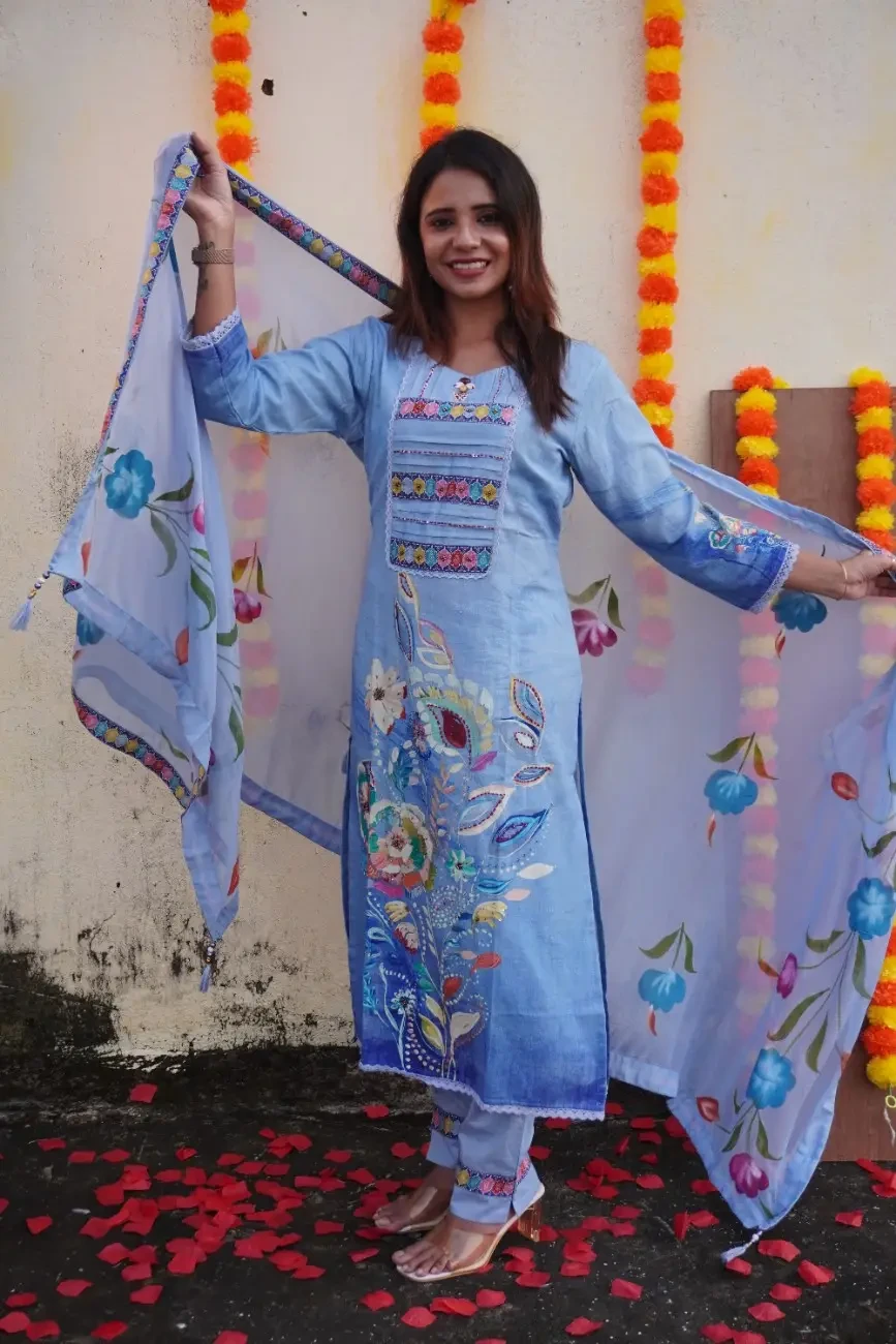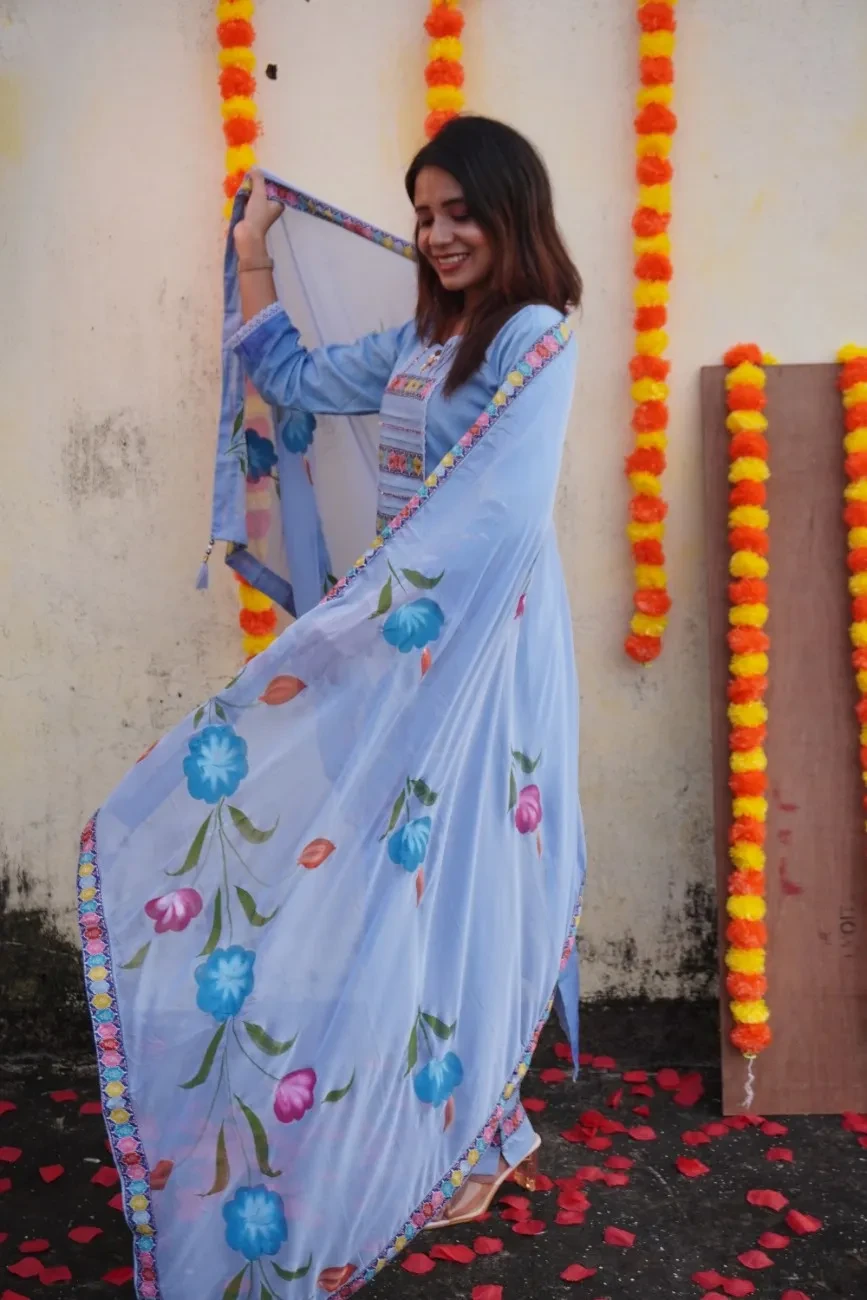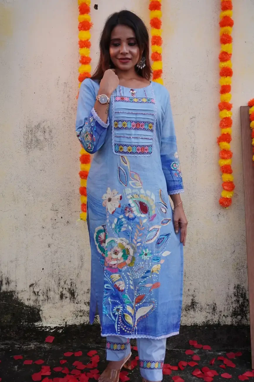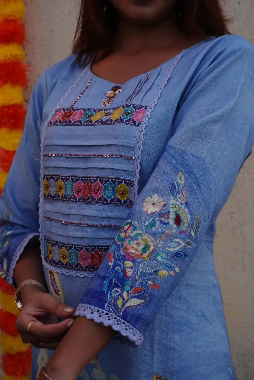 Add elegance to your festive wardrobe with this sky-blue cotton kurta, designed with a perfect balance of traditional and artistic elements. The yoke features pleated panels embellished with multicolored floral borders and delicate sequin highlights, giving it a festive sparkle. The sleeves are adorned with intricate hand-painted floral and leaf motifs, adding a unique artisanal touch.