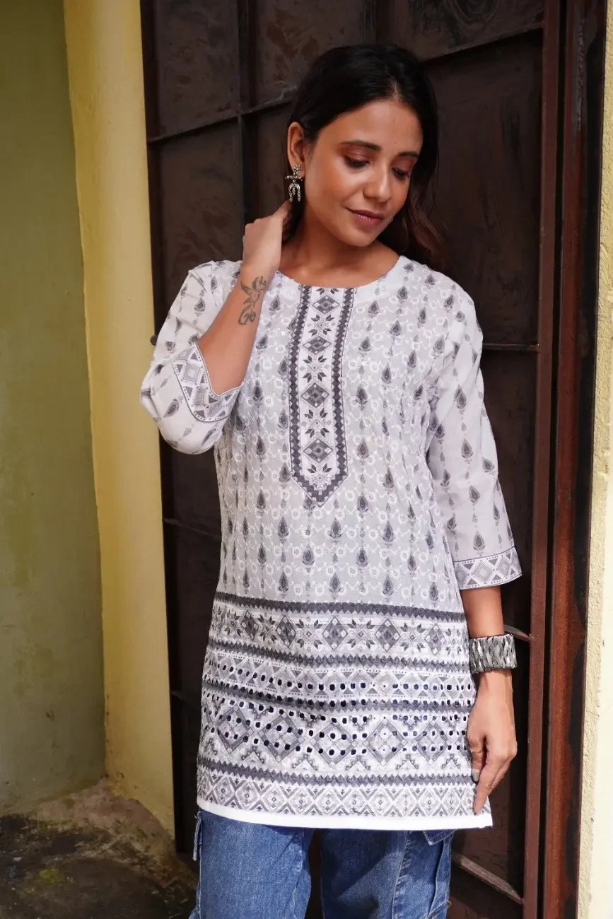 Add subtle sophistication to your ethnic wardrobe with this Women's Monochrome Printed Cotton Kurti. Designed in a classic grey and white palette, this kurti features intricate ethnic patterns and a beautifully detailed border that elevates its traditional charm. Crafted from premium cotton, it ensures day-long comfort while keeping your look fresh and effortless.